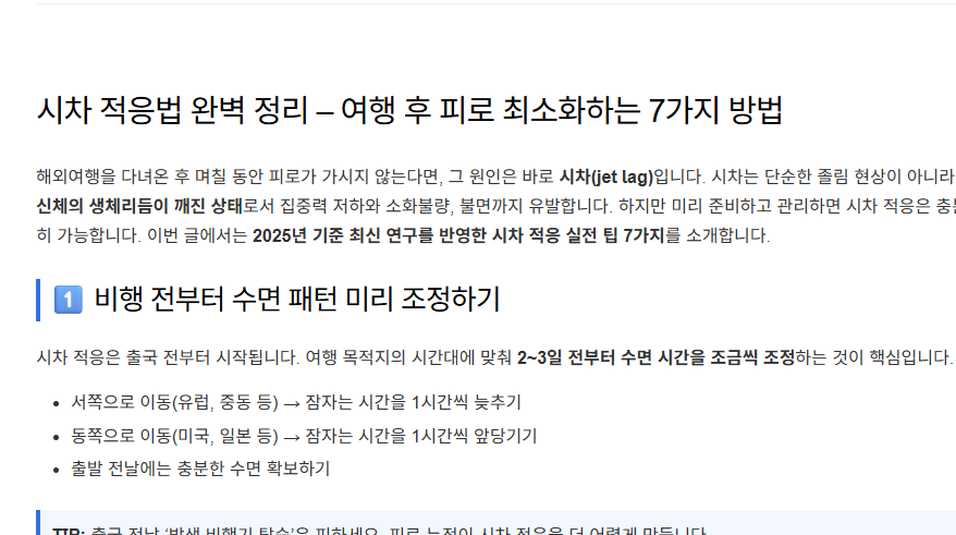 해외여행을 다녀온 후 며칠 동안 피로가 가시지 않는다면, 그 원인은 바로 시차(jet lag)입니다. 시차는 단순한 졸림 현상이 아니라, 신체의 생체리듬이 깨진 상태로서 집중력 저하와 소화불량, 불면까지 유발합니다. 하지만 미리 준비하고 관리하면 시차 적응은 충분히 가능합니다. 이번 글에서는 2025년 기준 최신 연구를 반영한 시차 적응 실전 팁 7가지를 소개합니다.